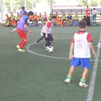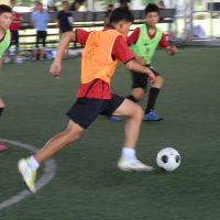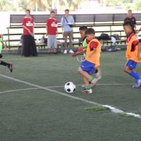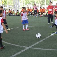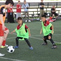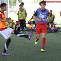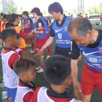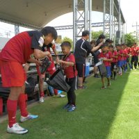 午前9時半に始まったスクール。1年ぶりとなる子供たちは逞しく成長し、年長の選手らは鋭いシュートを放つなど、コーチ陣と互角の勝負を繰り広げていた。終了後は、笑顔で記念撮影。レッズがこの日のために持参したグッズを手渡すと満面の笑みで喜びを表していた。