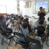 スクンビット39にある「ボイスホビークラブ」のセミナールーム。日系の企業に勤める駐在員やその家族、30人以上が集まった。繰り広げられる一つ一つのマジックの技に、子供たちからは大きな歓声が聞かれた。