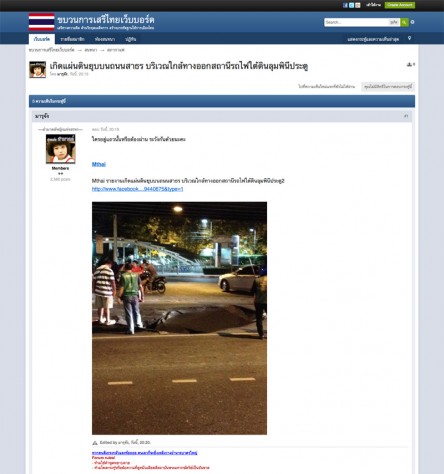 ANNGLE·タイニュース·03/18/2012·[速報]ラマ4世通りのMRTルンピニ駅で道路の陥没事故 本日の20.00時頃、ラマ4世通りのMRTルンピニ駅付近(2番出口)で道路の陥没事故が起きました。陥没した穴の大きさは幅は5メートル、深さは2メートル。今のところ原因は不明で、インターネット上ではちょっとした騒ぎになっている様子。幸い怪我人はなく、現在現場を管轄するトゥン・マハメーク警察が事故の原因を調べております。 情報元:webboard.serithai.net bit.ly/lumpinijiko03182012