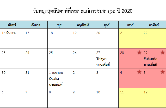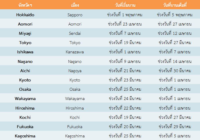 สำหรับเมืองใหญ่เมืองอื่น ๆ เช่น ฟุกุโอกะจะเริ่มบานในช่วงวันที่ 20 มีนาคม นาโกย่าจะเริ่มบานช่วงวันที่ 21 มีนาคม โอซาก้าจะเริ่มบานช่วงวันที่ 25 มีนาคม เซนไดจะเริ่มบานช่วงวันที่ 7 เมษายน ซัปโปโรจะเริ่มบานช่วงวันที่ 1 พฤษภาคม ส่วนเมืองอื่น ๆ นอกจากนี้นั้นสามารถเช็คที่ตารางด้านล่างได้เลยค่ะ